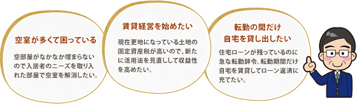 賃貸経営のことでオーナー様がお悩みのことがあれば、何でもご相談ください。